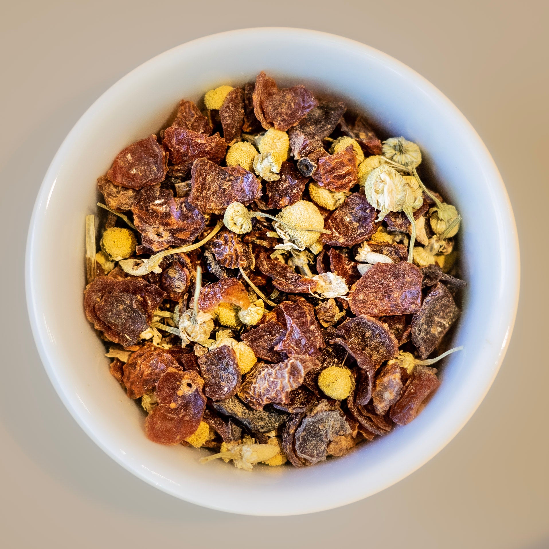 Ingredients: organic ginger, organic ginseng, organic rosehips, organic chamomile, organic orange peel, organic mint